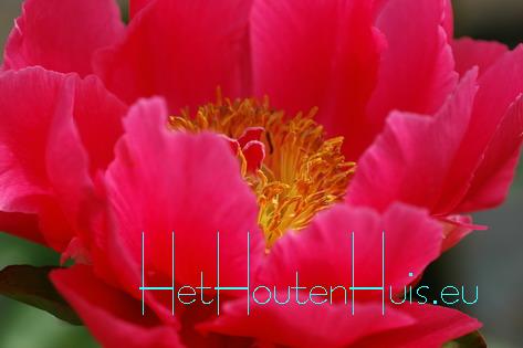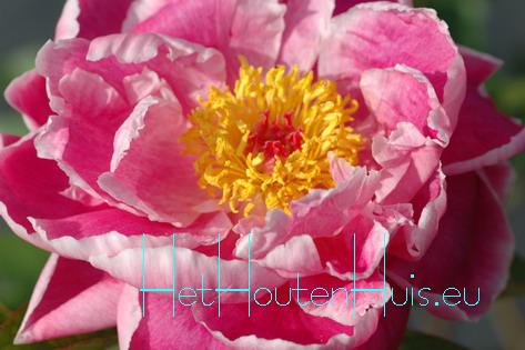 Pioenroos slanke, rechtopgaande Pioen goede snijbloem de bloemen hebben een prachtige krans van lange, goudgele meel-draden in het hart z.g. Japansevorm lichtgroen, glanzend blad |