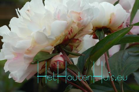 Pioenroos prachtige gevulde Pioen met room- witte bloemen rijkbloeiend met grote, naar rozengeurende bloemen met eencremegeel hart, soms met rodestreepjes, stevige stelen nieuw |