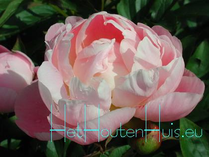 Pioenroos een prachtige Pioen met gevulde, glanzend lichtroze bloemen op stevige stelen boven vrij groot,donkergroen blad is een heel gezonde groeier laatbloeiend |